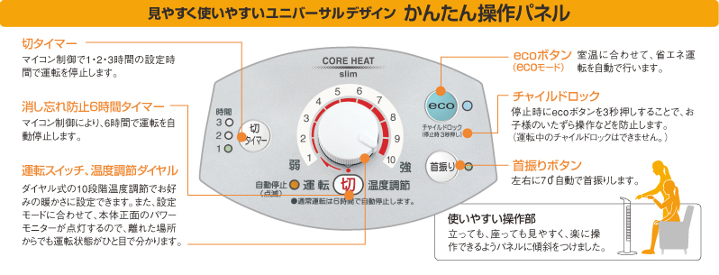 corona DH-911R(コアヒートスリム)は人に優しい機能やデザインがいっぱいです。使いやすさを重視し安全、エコにも配慮した遠赤外線暖房です。